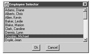 If the pick list returns a -1 value, you know that the user has canceled his selection. Otherwise, the value returned is the row number that is selected. You retrieve the EmployeeRecord at that row, make it the current record, and request that the user interface display it.