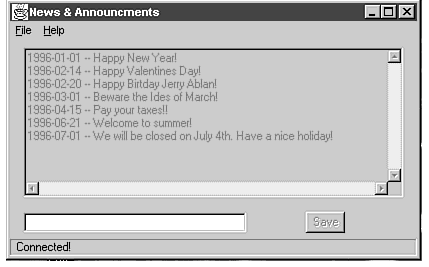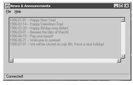 The rest of this chapter will discuss the implementation of the News & Announcements program. First, I'll discuss the user interface and how it was created. Secondly, I'll discuss the database access used in the program. Finally, I'll cover any programming pitfalls that came up during the application construction.