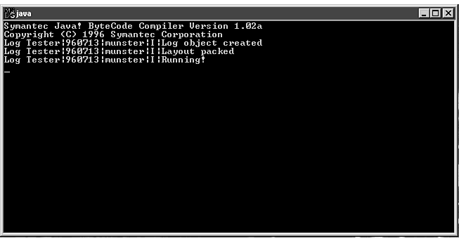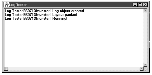 This takes the name of the application for the log entries as input. Because this log type displays to the screen, there is no need for a disk filename or path. Figure 9.1 shows the output of a ScreenLog.