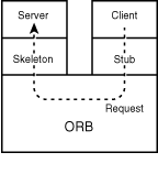 When you go from IDL to your implementation language, you generate a stub and a skeleton in the implementation language. The stub is the interface between the client and the ORB; the skeleton is the interface between the ORB and the object (or server). Figure 18.1 shows the relationship between the ORB, an object, and a client wishing to invoke a method on the object.