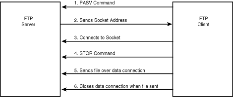 Once the server returns the response, the client can establish the data connection. Figure 8.3 shows the typical interaction sequence between an FTP server and a client performing a STOR command, using PASV to set up the data connection.