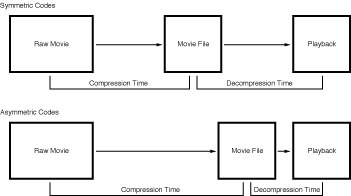 Codecs are often referred to as being symmetric or asymmetric (see Figure 10.12). These terms refer to balance of the speed of compression and speed of decompression. A symmetric codec takes the same amount of time to compress a movie as it does to decompress it, which is good for production time but not as good for playback. Asymmetric codecs usually take a very long time to compress, but make up for it by being fast to decompress (and remember, the faster it takes to decompress a movie, the better frame rate you can get, and so asymmetric codecs tend to be more desirable). Most codecs are at least a little asymmetric on the compression side; some are very much so.