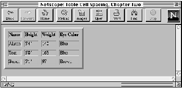 Cell spacing also includes the outline around the table, which is just inside the table's border (as set by the BORDER attribute). Experiment with it, and you can see the difference. For example, Figure 13.30 shows an example of a table with cell spacing of 8 and a border of 4.