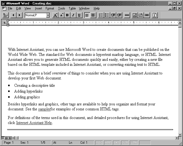 Internet Assistant is a plug-in for Word for Windows 6.0 that allows you to create your HTML files directly in Word and then save them as HTML (see Figure 6.9). If you stick to the style sheet included with Internet Assistant and you understand HTML's limitations, this can make creating HTML documents almost easy.