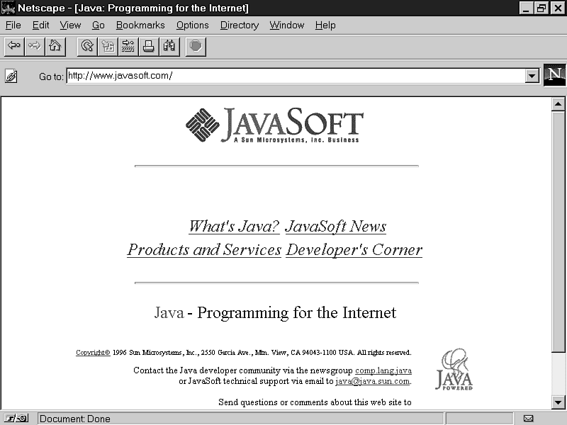Eventually, the developers created a PDA-like device to show off their efforts. Although the device used an early form of the Java programming language and a basic operating system and user interface, it was good enough to dazzle the executives at Sun. Around this time, the Green group developers incorporated under the name FirstPerson, Inc., which would later become JavaSoft. Figure 1.2 shows JavaSoft's site on the Web at http://www.javasoft.com/.