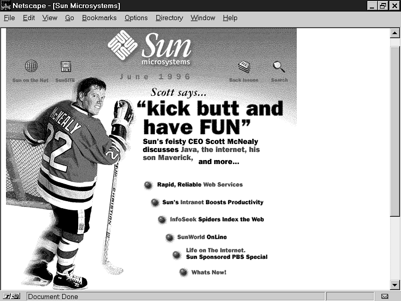 In 1991 Sun Microsystems, Inc. was just beginning its climb to the position as the top producer of UNIX workstations. The company had revenues of nearly $2.5 billion for the previous fiscal year, up from a mere $210 million in 1986, and it seemed that the company was unstoppable. Sun's rise to fame was largely due to its pioneering efforts in open systems that enable businesses to build and maintain open network computing environments. Corporations raced to embrace Sun's open systems because they were fed up with the high costs and fees associated with closed network environments. Sun was climbing to the top of the mountain, and its executives knew it. Figure 1.1 shows Sun's site on the Web at http://www.sun.com/.