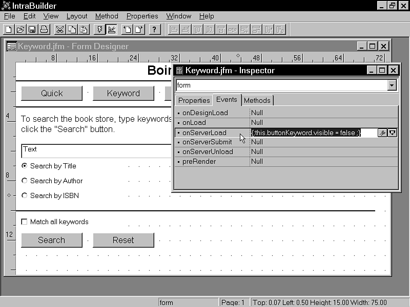 The steps in this section guide you through the user interface design of the Keyword form. There are three phases to the design. In the first set of steps, you create the form and add all necessary controls. You can then test the design by incorporating the Keyword form into the Help form's include file. The second series of steps takes care of cosmetic issues that appear when running the form. The last series of design steps includes adding a query to the form and setting up some JavaScript placeholders. The following is the first series of steps for creating the initial version of the Keyword form:
