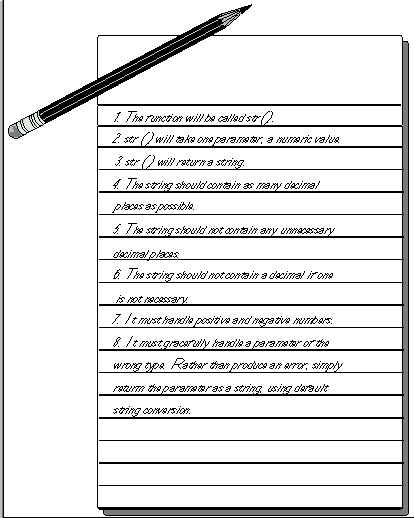 Suppose that this conversion is the problem that you need to solve in IntraBuilder. So the planning begins. One important step in reducing errors and producing solid code is code reuse. Because you have to solve this problem now, solve it well and solve it in a way that enables you to reuse the solution later. So, rather than solve the problem in the particular form that is displaying the number, create a function that can be used any time that you need to convert a number to a string. As the planning phase continues, you come up with the criteria shown in Figure 16.1.