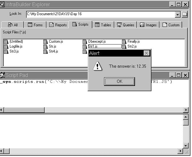 The script shown in Listing 16.1 compiles fine and produces four alert boxes that show the expected results. Figure 16.3 shows the first of these alert boxes.