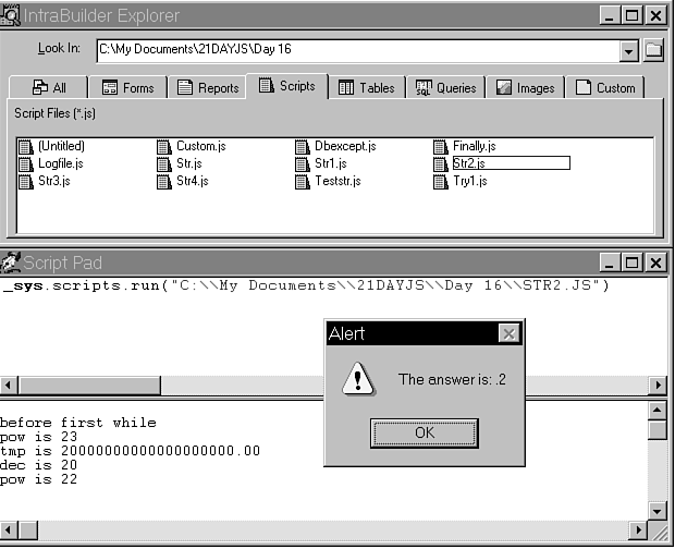 To explore some of these problems and ways to solve them, you will write a couple of functions today. The first function will work around a particular oddity found in IntraBuilder's implementation of the JavaScript language. After identifying the problem and charting the course to the solution, you will go through the process of building, testing, and debugging some JavaScript code.