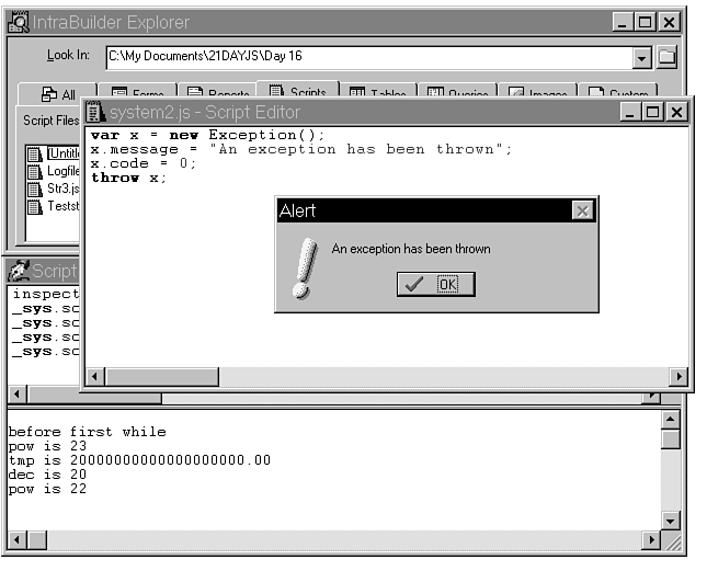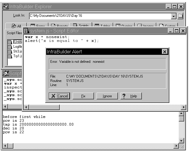 Now that you have some bugs to work on, the debugging begins. Although many development products come with integrated debuggers, IntraBuilder does not. This makes debugging a little more difficult, but it sure doesn't make it impossible. The real need during debugging (and which debuggers simply make easier) is to track script flow and the values of variables within the script.
