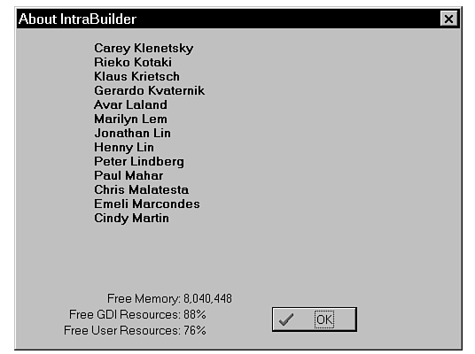 IntraBuilder contains hidden credits. As with most Windows software, the IntraBuilder Easter egg is in the About box. To see a list of the many people who brought you IntraBuilder, follow these steps: