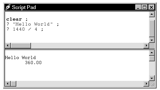 The clear command clears output from the results pane. This is synonymous with the _sys.scriptOut.clear() method. This is one of two Xbase commands that make it easier to work with the Script Pad's results pane. The other command is the question mark, which is documented. You can use the Xbase output commands as shortcut versions of _sys.scriptOut methods. Figure B.6 shows how you can use the commands to quickly evaluate simple expressions.