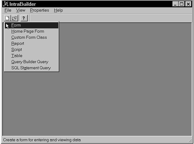 Let's begin by creating a form using the IntraBuilder Form Expert. Click the New button on the IntraBuilder toolbar, and then select Form from the pop-up menu, as illustrated by Figure 3.1.