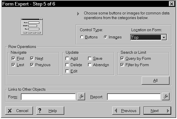 Click the All button in the Row Operations panel to include all possible buttons on the form. If you select Buttons in the Control Type radio button group, you'll get buttons with text labels on your new form. If you select Images, you'll get buttons with graphic labels instead. The Location on Form drop-down list determines where the buttons actually appear on the form.
