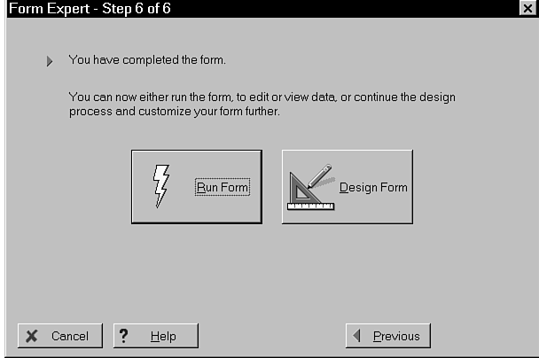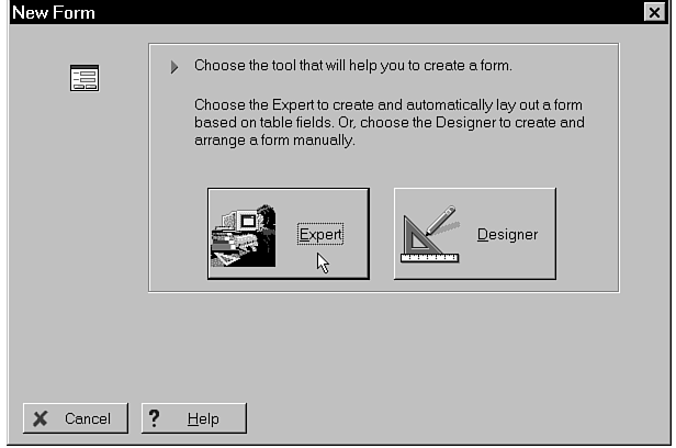 After you've selected Form, a dialog box appears asking you to choose whether to create the new form using the Form Expert or the Form Designer, as shown in Figure 3.2. Click the Form Expert button.