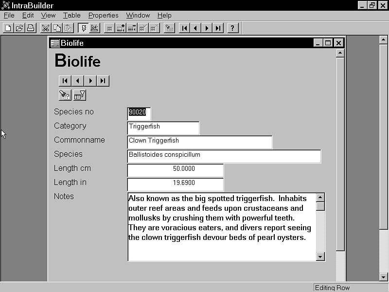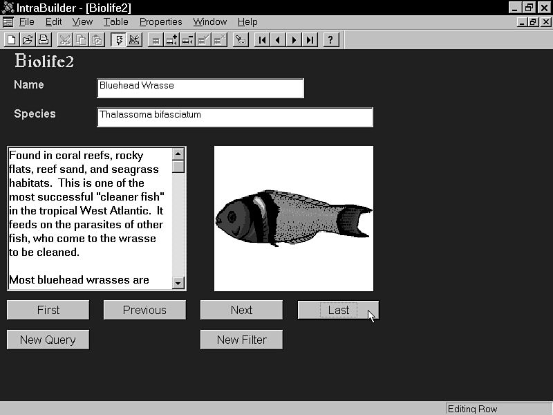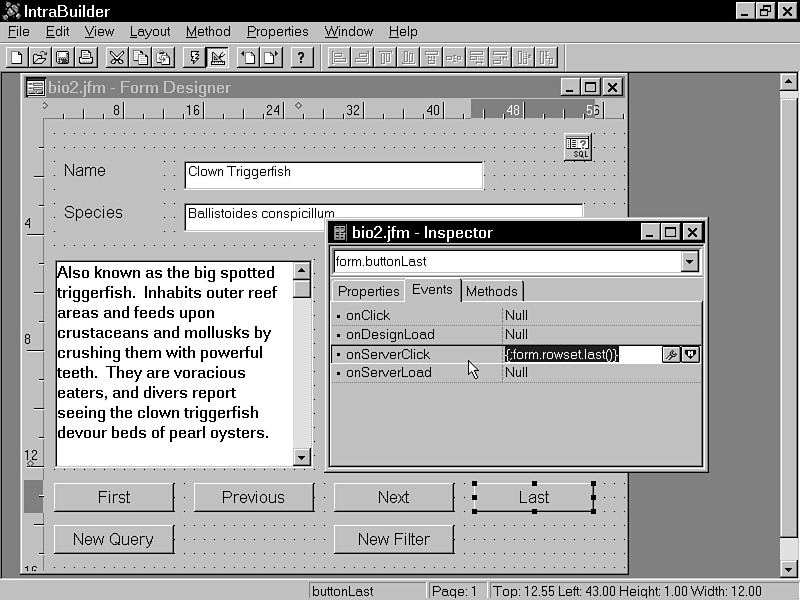 An easier way to add queries to a form is to drag them from the IntraBuilder Explorer and drop them on the Form Designer. When you drop a table on a form, IntraBuilder sets the sql and active properties for you. The drag-and-drop approach also creates more intuitive query names such as biolife1, instead of query1. The first table you drop on a form is set to the form's rowset. |