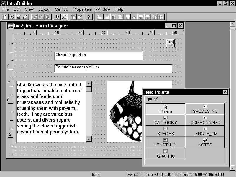The next step you'll take is to drop the fields returned by your Query component onto your new form. If the Field Palette isn't visible already, click the View|Field Palette option to make the palette visible. After the Field Palette is on-screen, drag each of the fields it lists onto the form, positioning them toward the horizontal center of the form, each one below its predecessor. Align the fields along their left edges and size the NOTES and GRAPHIC fields so that they look sensible. Note that you may need to widen your form to achieve the desired effect. Notice that each field already displays data. This is because you set the Query component's active property to TRUE earlier. Because the Query is active (open), its result set is available and displayed by the IntraBuilder Designer.