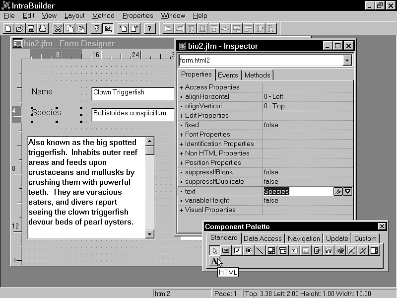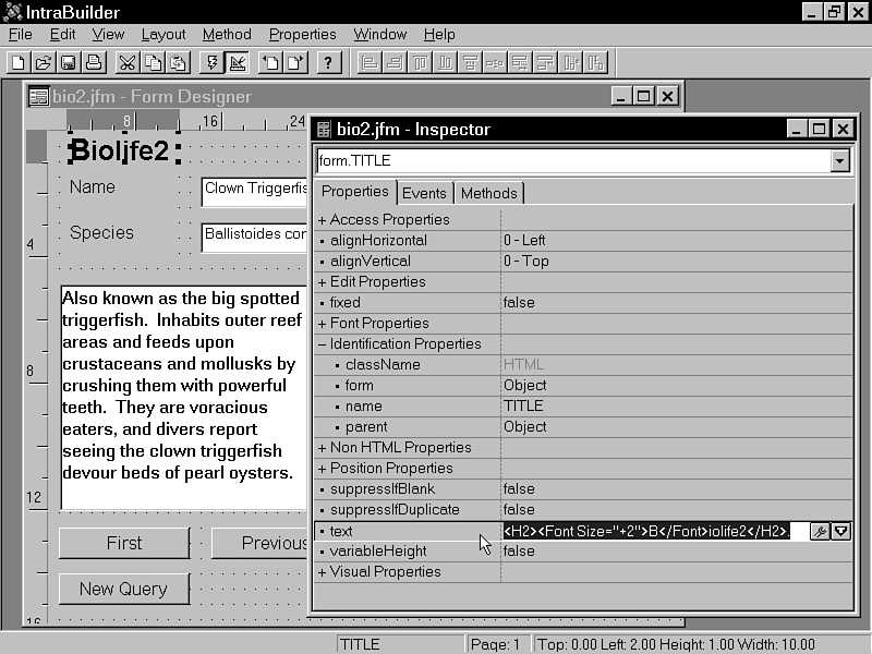 Begin by clicking the form's background and then selecting its title property in the Inspector. Set the form's title property to Biolife2. Next, drop an HTML component onto the form and position it in the upper-left corner. Size the control so that it forms a vertical rectangle to the left of your label components. Set its name property to TITLE. Next, set its text property to the following string: