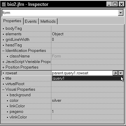 Click anywhere on the background of the form, and then bring up the Inspector and set the form's rowset property to parent.query1.rowset, as shown in Figure 3.18.