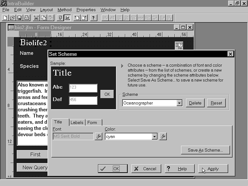 Now that your form's title component is established, you're ready to set the color and font scheme that you want the form to use. Select Layout|Set Scheme. Just as when you constructed a new form using the Form Expert, you're able to set the colors and fonts of the items on the form, as well as the background bitmap of the form itself, in one easy step. After the Set Scheme dialog box appears, select one of the built-in schemes, then click Apply, followed by OK. Figure 3.21 shows what your new form might look like if you apply the Oceanographer scheme.