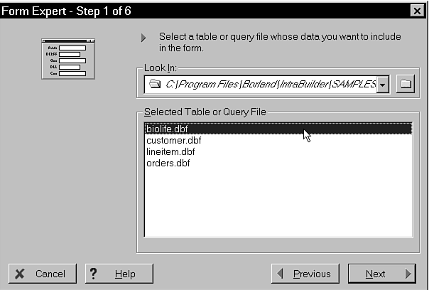 After you've clicked the Form Expert button, you'll be presented with a dialog box in which you can specify your new form's base table or query. By default, Paradox and dBASE tables are listed, along with any query files (those having .SQL or .QRY extensions) presently in the Look In directory. Click the folder icon to the right of the Look In drop-down list box and select the Samples subdirectory under your IntraBuilder base directory (which will probably be C:\Program Files\Borland\IntraBuilder\SAMPLES).
