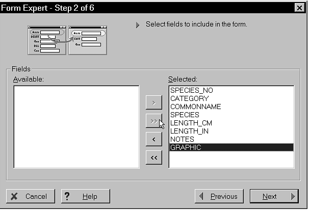 After you've selected your base table, the next step is to select which of its columns you'd like included in the new form. A dialog box like the one shown in Figure 3.4 is displayed, and you can choose which of the table's fields you want on the form. You can click the single right-arrow (>) to add individual fields, or you can click the double right-arrow (>>) to add all the fields to the form. Click the doubleright-arrow now to add all of BIOLIFE's columns to your new form, and then click Next.