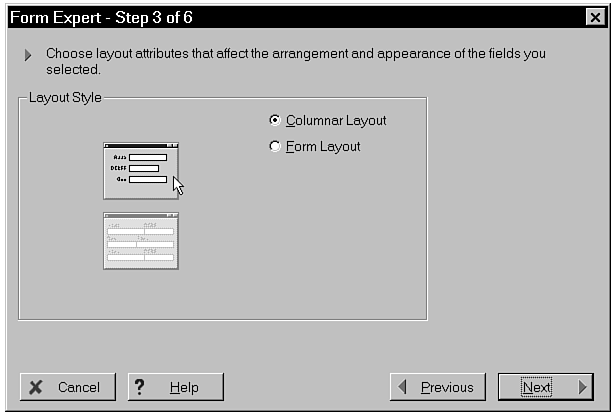 After you've selected which columns to include, you're then asked to select a basic layout for the new form, as shown in Figure 3.5. You've got two choices: Columnar and Form Layout. Selecting Columnar Layout vertically aligns the table columns on the form. Selecting Form Layout places them next to each other in a multiple-row, horizontal format. Click Next to accept the default Columnar Layout for your new form.