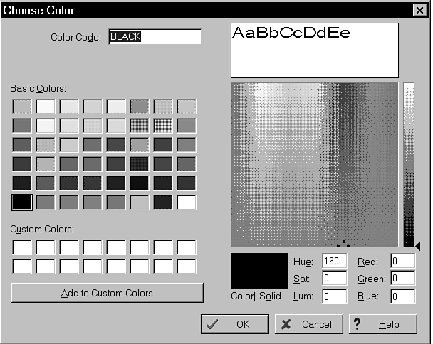 To adjust the color of a particular display element, either select a new color from the element's Color drop-down list or click the adjust button (the wrench) to the right of the list. Figure 3.6 illustrates the Choose Color dialog box that appears.