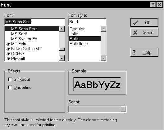 If you want to change the font specification for the title or labels placed on the form by the Form Expert, click either the Title or the Labels tab, and then click the adjust button (the wrench) to the right of the Font box. Figure 3.7 illustrates the Font dialog box.