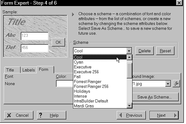 For now, select one of the built-in schemes and click Next to continue. Figure 3.9 shows how IntraBuilder displays the chosen scheme in a window.