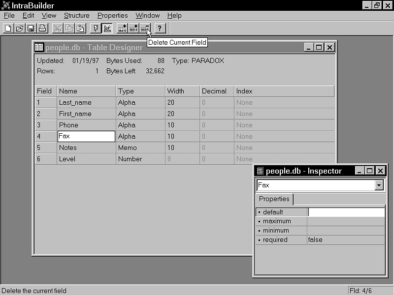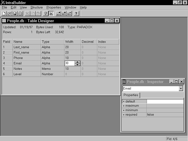 Unlike dBASE, Paradox lacks a sophisticated access control system. Paradox doesn't support internal users or user groups; those are left to the domain of the network. You can control table-level access with network access rights, but there's no provision for field-level access control in IntraBuilder. If you need security features beyond the most basic, the Paradox table format is not your best choice.