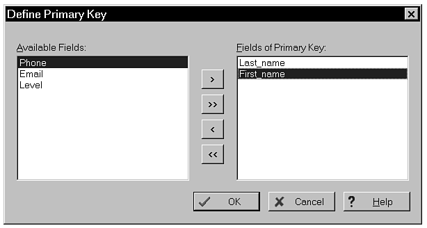 Figure 7.12 : Use the Define Primary Key dialog box to select your table's primary key fields.