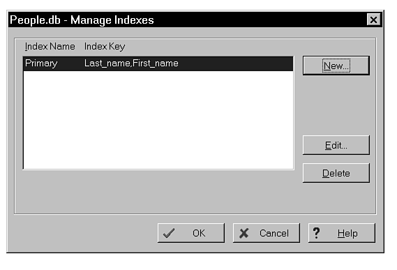 After you return to the Manage Indexes dialog box, you should see your new index listed. IntraBuilder names single field indexes after their key fields. Composite key index names are blank by default, though you can (and should) name them. Figure 7.15 shows what your Manage Indexes dialog box might look like now.