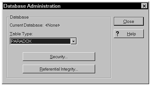 You set up both of these items by selecting File|Database Administration. Change the Table Type to Paradox. Figure 7.16 shows the Database Administration dialog box.