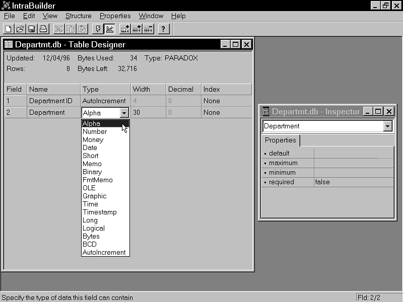 As illustrated by Figure 7.2, Paradox tables support a wide array of field types. The list of supported types compares quite well with supported field types in SQL databases.