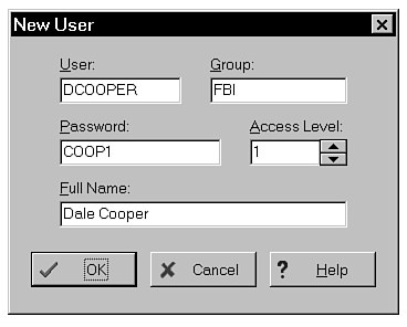 For our purposes, you can come up with your own user and group name. You can leave the Access Level entry box at its default of 1. Click OK when you're finished. Figure 7.22 shows an example of the completed New User dialog box.
