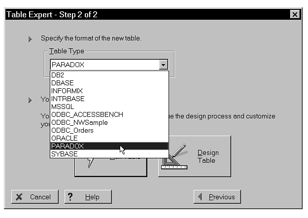 Though IntraBuilder doesn't have a separate table object (tables are accessed by using Query objects), you can still readily access tables from a variety of Database Management System (DBMS) platforms. For example, you can access dBASE and Paradox tables because the Borland Database Engine (BDE) supports them natively. You can also access DBMSs for which you have BDE SQL Links drivers. SQL Links drivers are included with the Professional and Client/Server versions of IntraBuilder. IntraBuilder Professional includes SQL Links drivers for Microsoft SQL Server and Borland InterBase. IntraBuilder Client/Server includes these two plus drivers for Oracle, Sybase, DB2, and Informix.