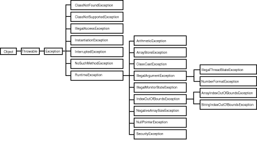 Both the Exception and Error classes are derived from Throwable. Exception and its subclasses are used to indicate conditions that may be recoverable. Error and its subclasses indicate conditions that are generally not recoverable and should cause your applet to terminate.