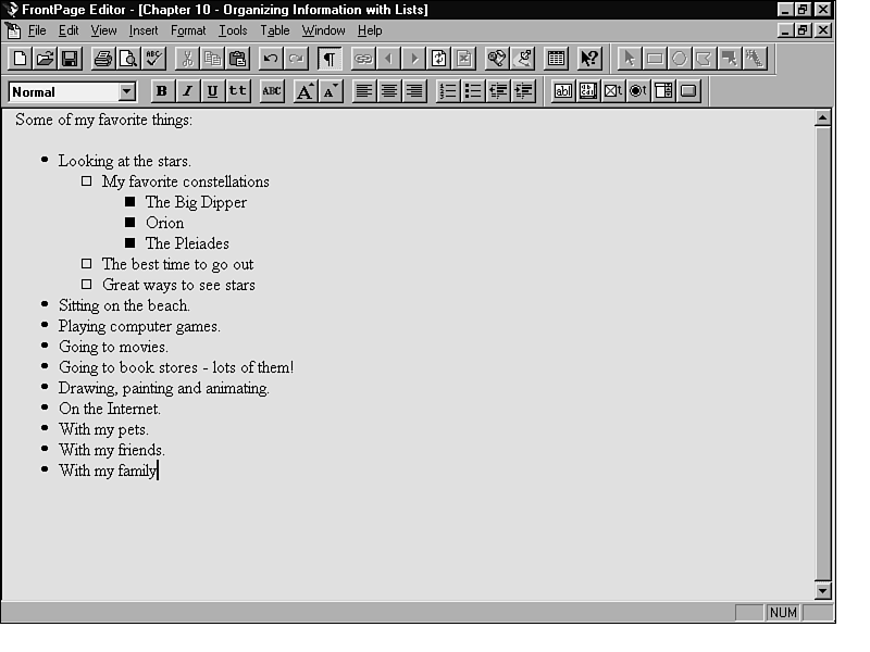 When you want to list items but do not have to put them in a specific order, you can use bulleted lists. Many people use bulleted lists to display links to their favorite sites, and there are many other applications for them as well. In most browsers, bulleted lists are displayed as paragraphs separated by white space. Items are preceded by bullets, which are sometimes rendered differently. For example, when the list shown in Figure 10.5 is opened in Netscape, it looks the same as it does in the FrontPage Editor. It uses unfilled and filled squares for the second and third levels. When the same list is displayed in Internet Explorer, however, round bullets are used for all the levels.