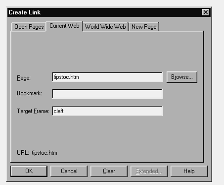 You also can add a target frame to a hotspot when you create it. Immediately after you draw the hotspot, the Create Link dialog box appears. Choose the Current Web tab, and specify the target frame, as in Figure 14.15.