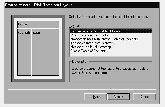Several frame templates have already been built for you. To use one of these predefined templates, select the Pick a Template option in the Choose Technique panel of the Frames Wizard. The steps are