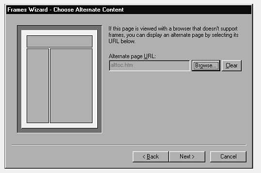 It is easy to generate the content for this page. Copy the contents of each section page to the clipboard and paste them in the alternate table of contents page. Then mention that this table of contents was loaded because the user did not have a frame-compatible browser. Provide links to sites where the user can download a browser that can handle frames.