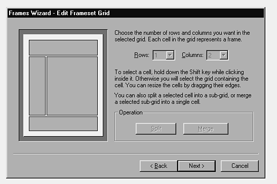 Don't go overboard on the number of frames in your frame set. Keep in mind that some people browse the Web with low screen resolutions. |