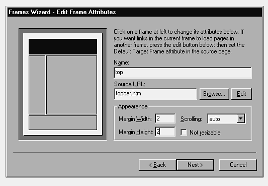 Take a look again at Figure 14.1. The frame set first loads into your browser, dividing the viewing window into three sections named topframe, left, and right. The source URLs then load into their respective frames.