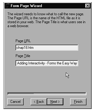 On the second screen of the Form Page wizard, shown in Figure 18.1, you enter a URL for the page and a page title.