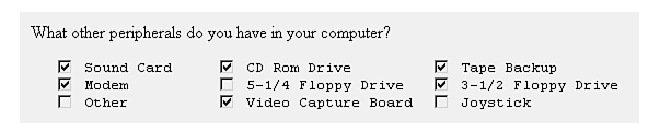 Ask an any of several options question when you want to provide one or more choices from a list of several. A typical question in this category is What other peripherals do you have in your computer?. Figure 18.10 shows an example of the output that you receive.