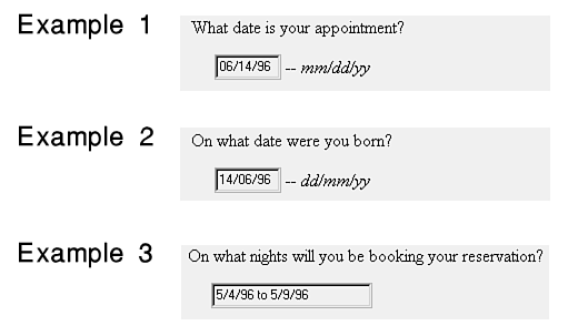 A date question asks the user for a date-a calendar date, not the romantic kind. The user can enter a date response in one of three ways. A typical question is On what date was this product purchased?. Figure 18.12 shows some examples.