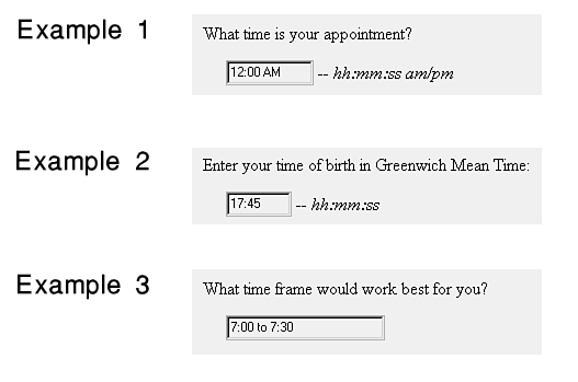 A time question asks the user for a specific time. A typical question is After what time can we contact you at this number?. Figure 18.13 shows other examples.