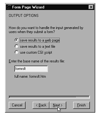 Click Finish to create your form. Your page appears in the FrontPage Editor window. At this point, you can save it to your web, or you can copy it to the clipboard and paste it into another page in your web.